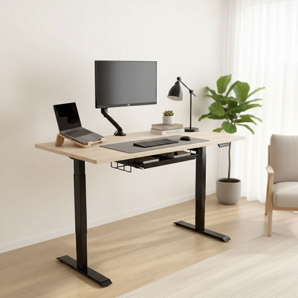 Desky těchto stolů jsou z laminované dřevotřísky s ochrannou ABS hranou. Kovové podnože mají variabilní délku a šířku bezmála 70 cm, což jim zaručí skvělou stabilitu. Napájení řeší kabel do klasické 230V zásuvky.