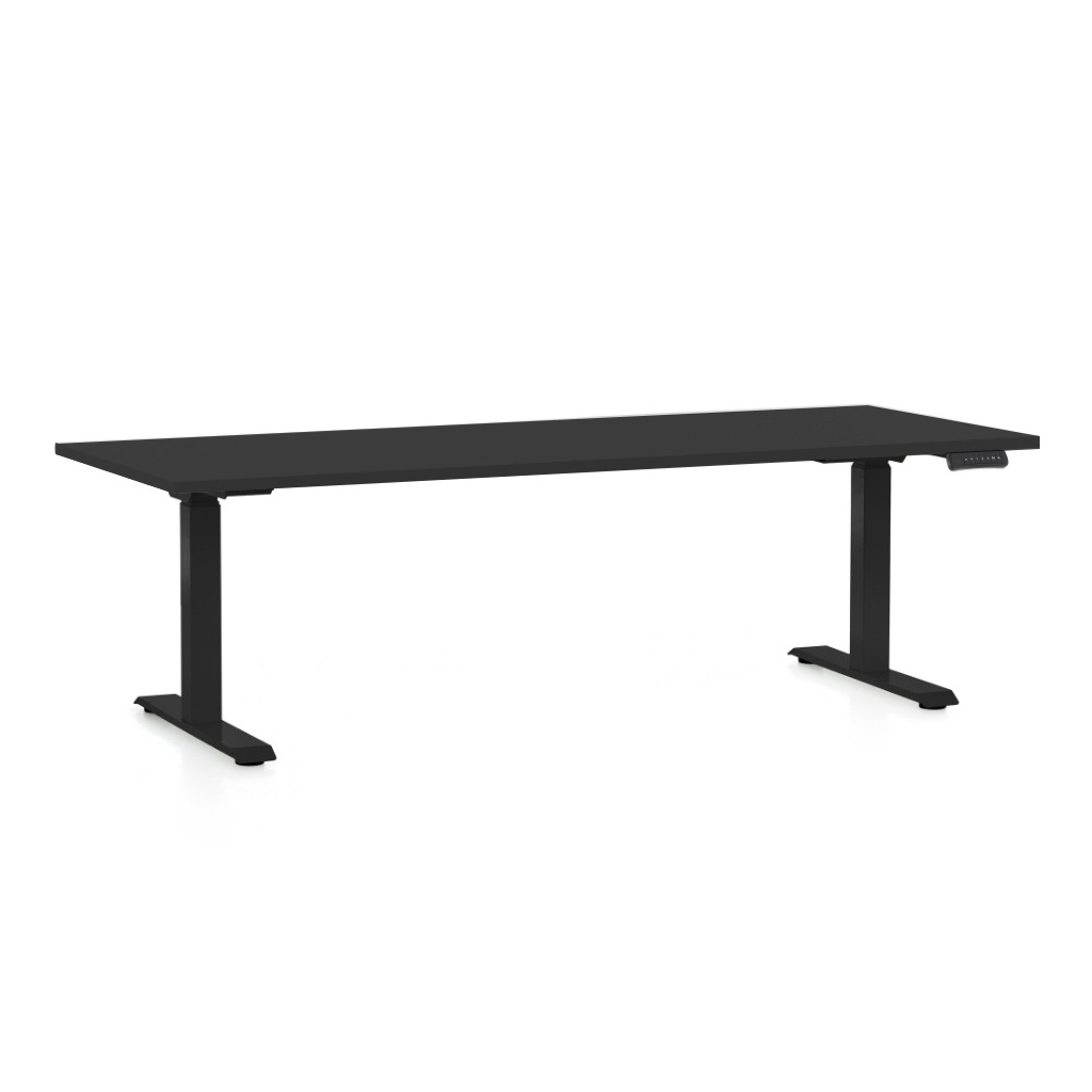 Desky těchto stolů jsou z laminované dřevotřísky s ochrannou ABS hranou. Kovové podnože mají variabilní délku a šířku bezmála 70 cm, což jim zaručí skvělou stabilitu. Napájení řeší kabel do klasické 230V zásuvky.