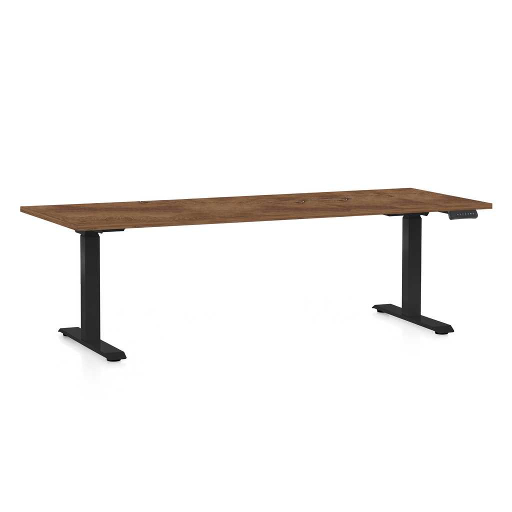 Desky těchto stolů jsou z laminované dřevotřísky s ochrannou ABS hranou. Kovové podnože mají variabilní délku a šířku bezmála 70 cm, což jim zaručí skvělou stabilitu. Napájení řeší kabel do klasické 230V zásuvky.