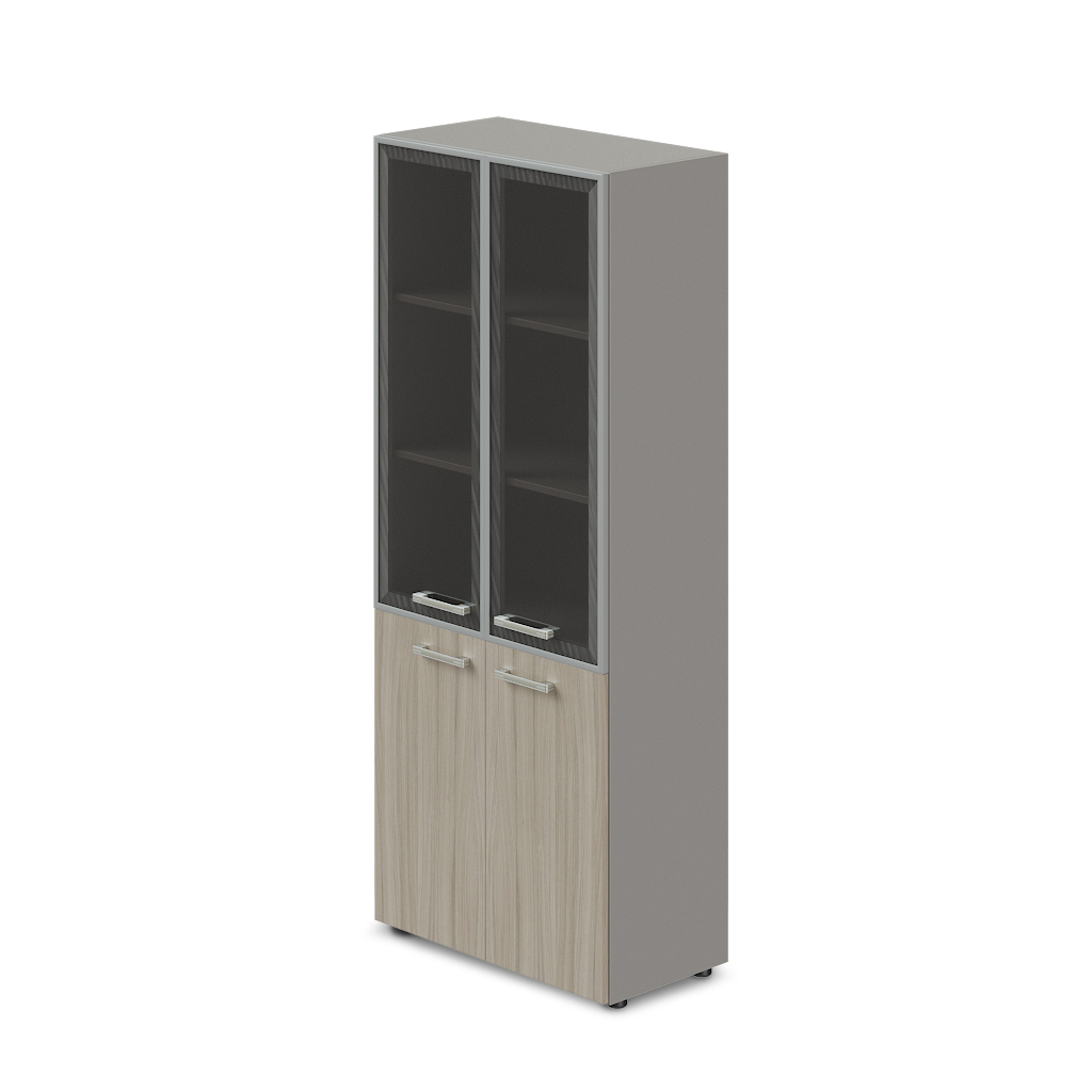 Skříň je vybavena kombinací skleněných i dřevěných dveří s kovovými úchytkami.