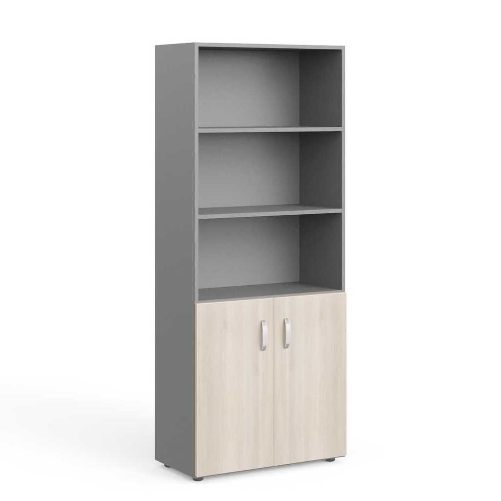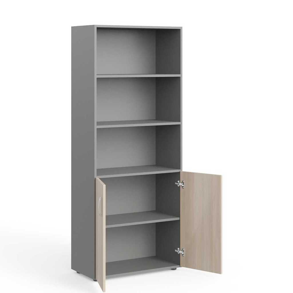 Skříň je dodávána společně se spodními dřevěnými dveřmi, které jsou vybaveny plastovými úchytkami. Horní část skříně je odkrytá a nabízí rychlý přístup. Pro sjednocení elegantního vzhledu vaší kanceláře si však můžete objednat obkladovou desku.