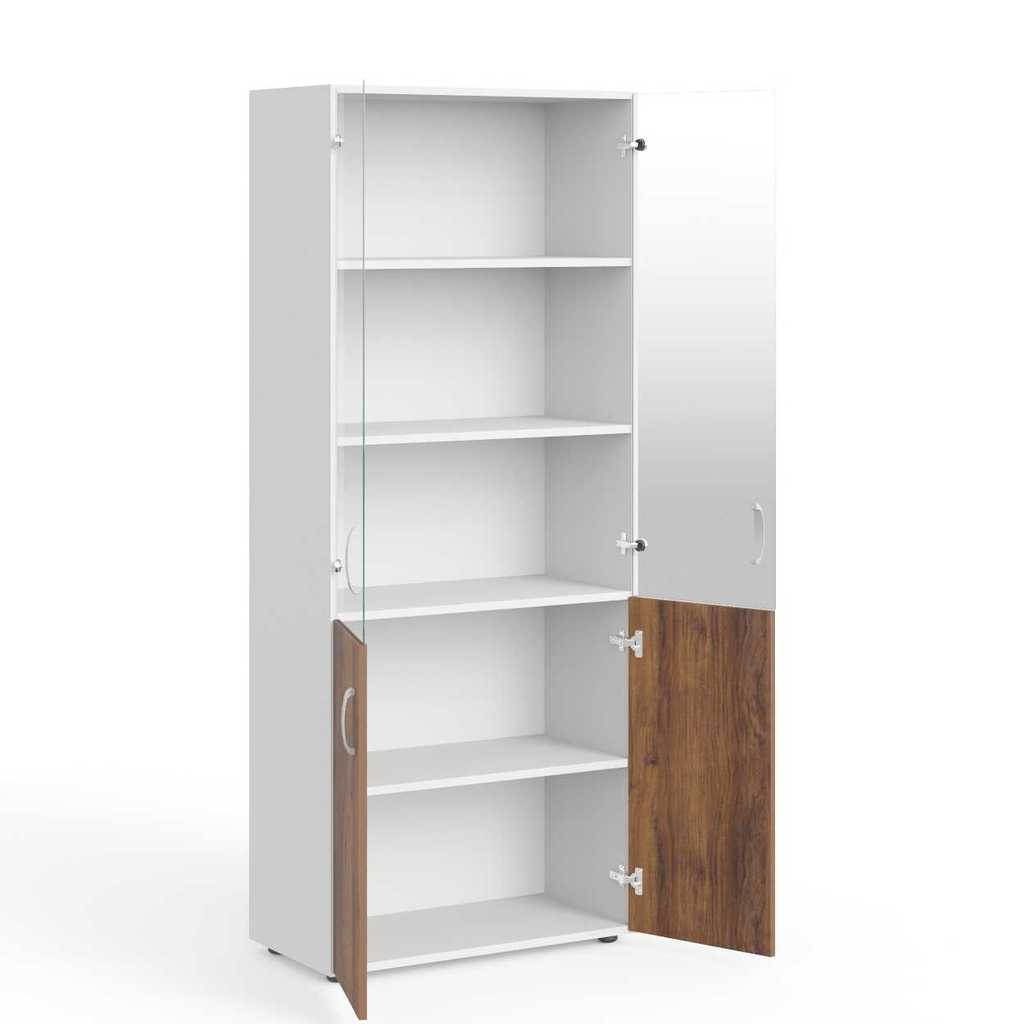 Skříň je dodávána společně se spodními dřevěnými dveřmi i skleněnými dveřmi, které jsou určeny pro horní část. Dveře jsou vybaveny plastovými úchytkami. Pro sjednocení elegantního vzhledu vaší kanceláře si však můžete objednat obkladovou desku.