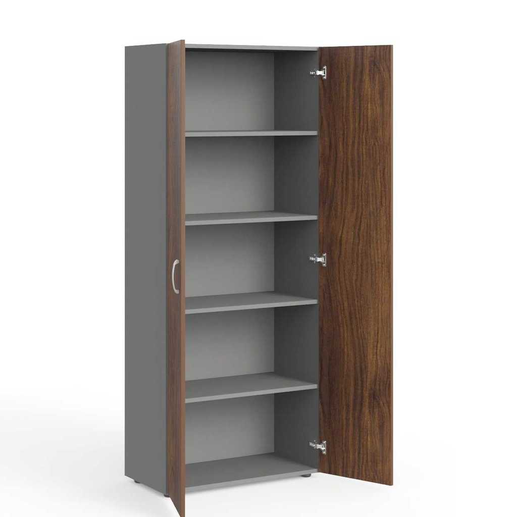 Skříň je dodávána společně s dřevěnými dveřmi, které jsou vybaveny plastovými úchytkami. Pro sjednocení elegantního vzhledu vaší kanceláře si můžete objednat obkladovou desku.