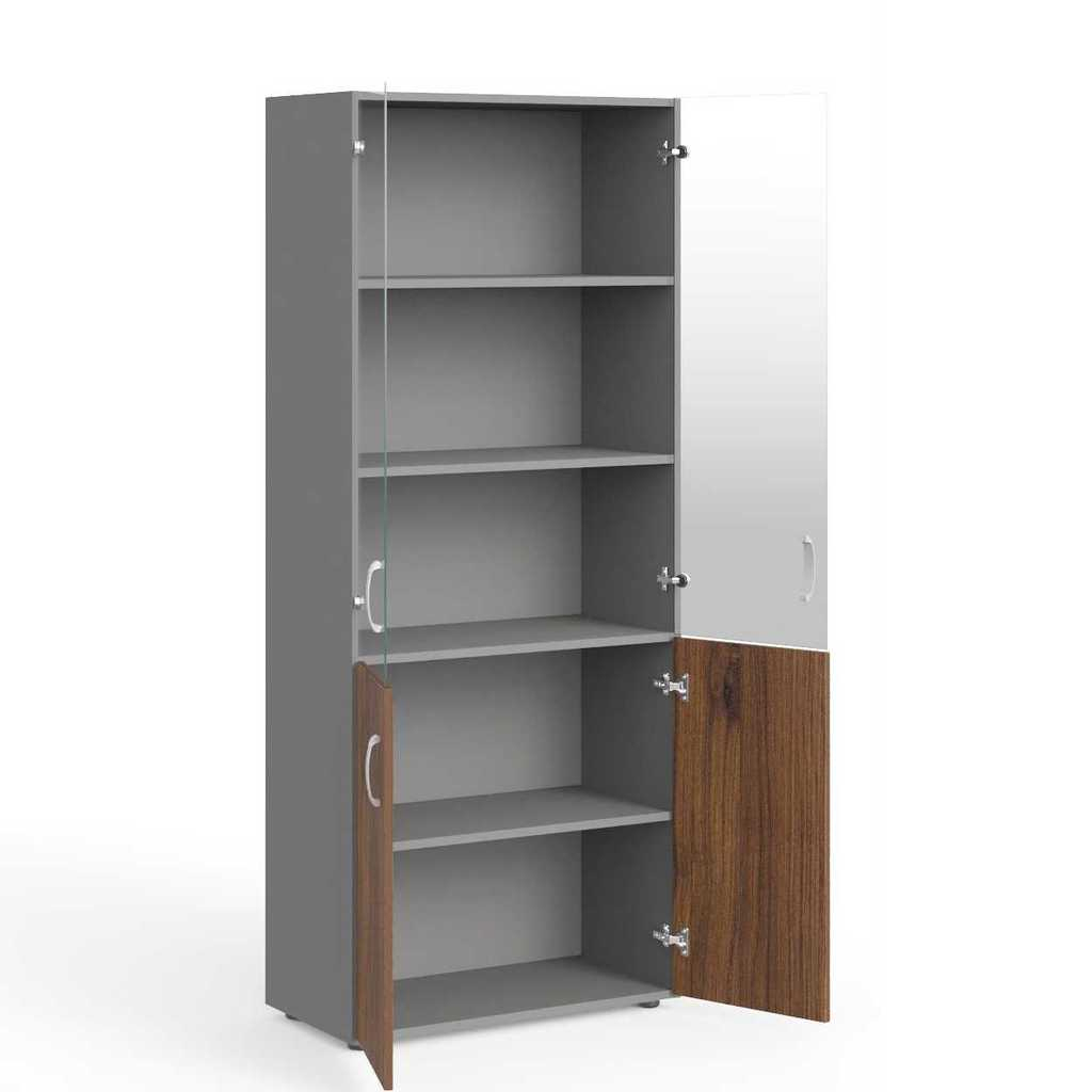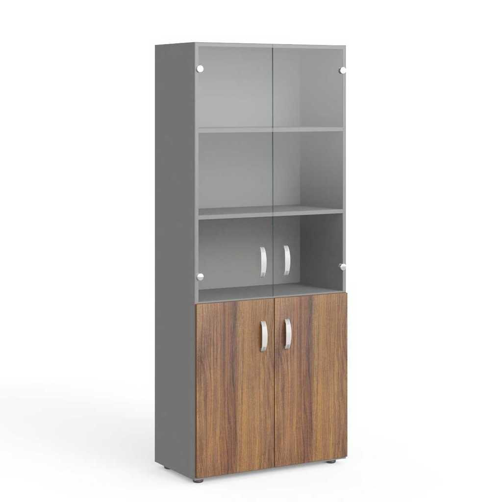 Skříň je dodávána společně se spodními dřevěnými dveřmi i skleněnými dveřmi, které jsou určeny pro horní část. Dveře jsou vybaveny plastovými úchytkami. Pro sjednocení elegantního vzhledu vaší kanceláře si však můžete objednat obkladovou desku.