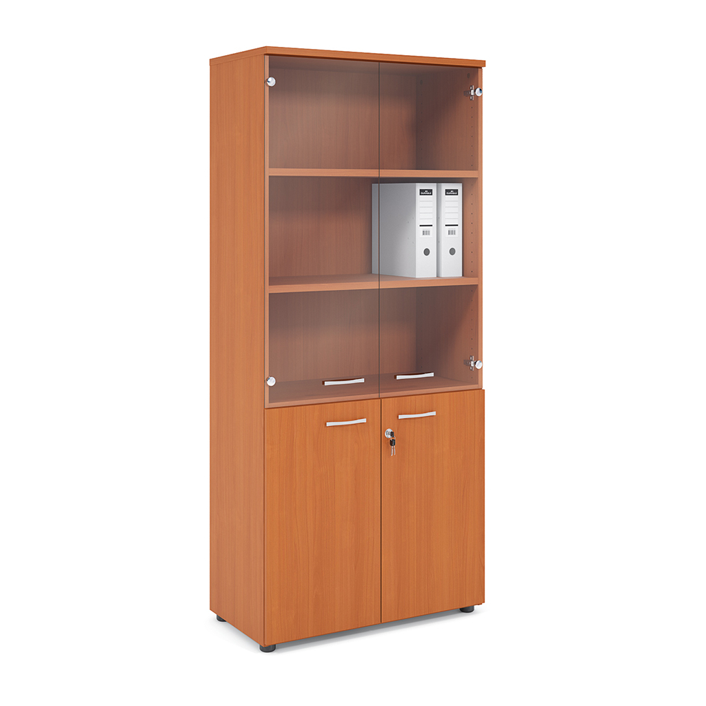 Skříň je dodávána se skleněnými křídlovými dveřmi, které jsou určeny pro horní část a se spodními křídlovými dveřmi ze dřeva, které jsou vybaveny kovovými úchytkami a bezpečnostním zámkem.