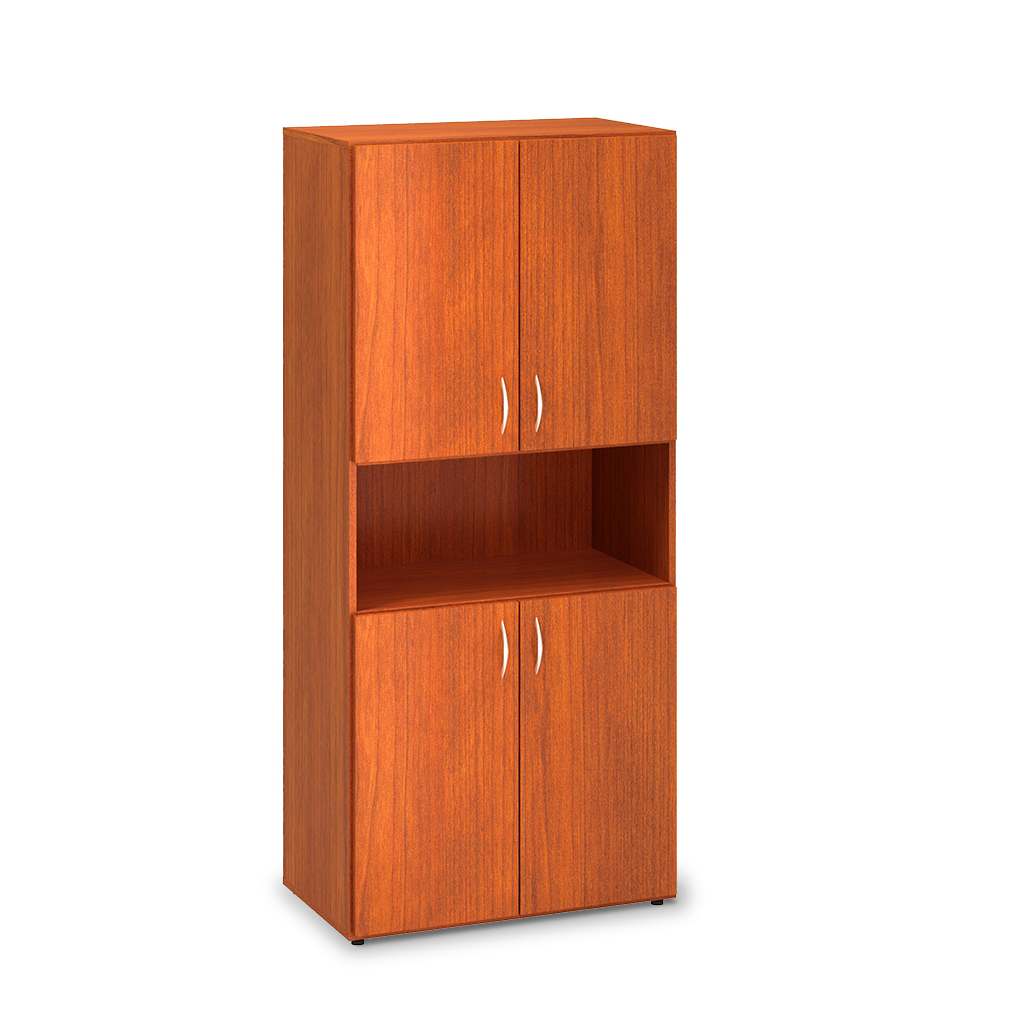 Tento typ skříně dodáváme s dřevěnými křídlovými dveřmi pro horní i spodní část skříně, střed tedy zůstává volný pro rychlý přístup k polici. Dveře disponují kovovými úchytkami.