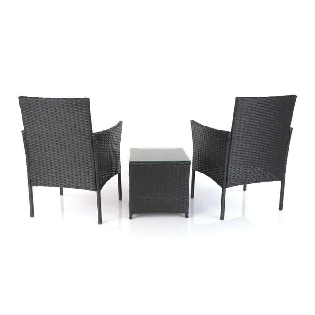 Konstrukce stolu i křesel je z černých kovových trubek a umělého ratanu. Ten zvládne déšť i letní slunce, a navíc příjemně větrá.