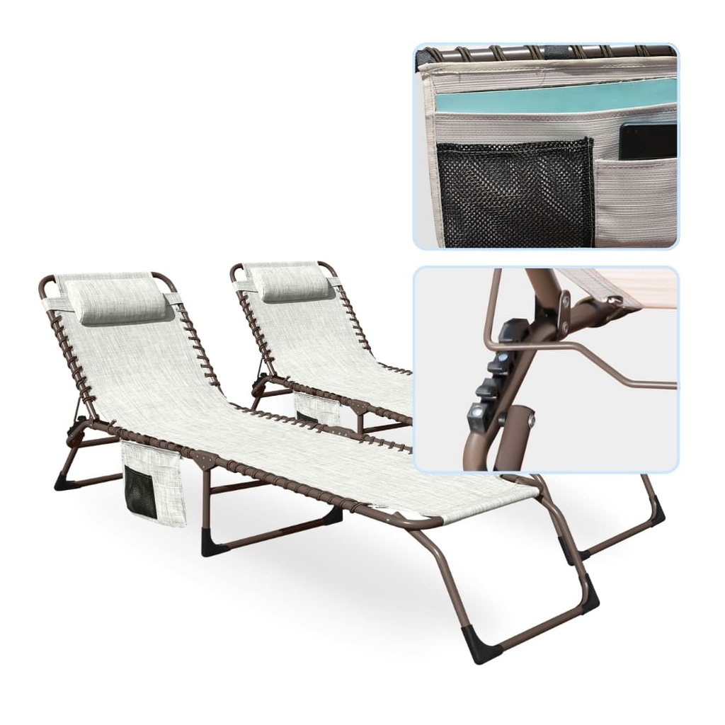 Samotná plocha lehátka je ze syntetické síťoviny, která na sluníčku uschne raz dva. K vašemu pohodlí přispěje také odnímatelná hlavová opěrka a praktická kapsa, kam si odložíte třeba knihu, telefon nebo lahev s vodou.