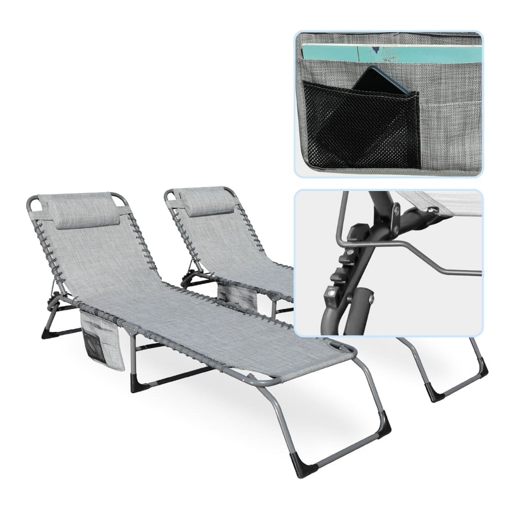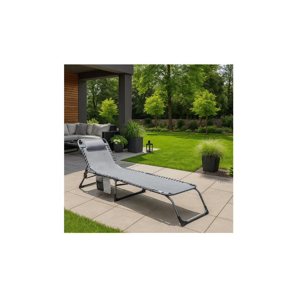 Samotná plocha lehátka je ze syntetické síťoviny, která na sluníčku uschne raz dva. K vašemu pohodlí přispěje také odnímatelná hlavová opěrka a praktická kapsa, kam si odložíte třeba knihu, telefon nebo lahev s vodou.