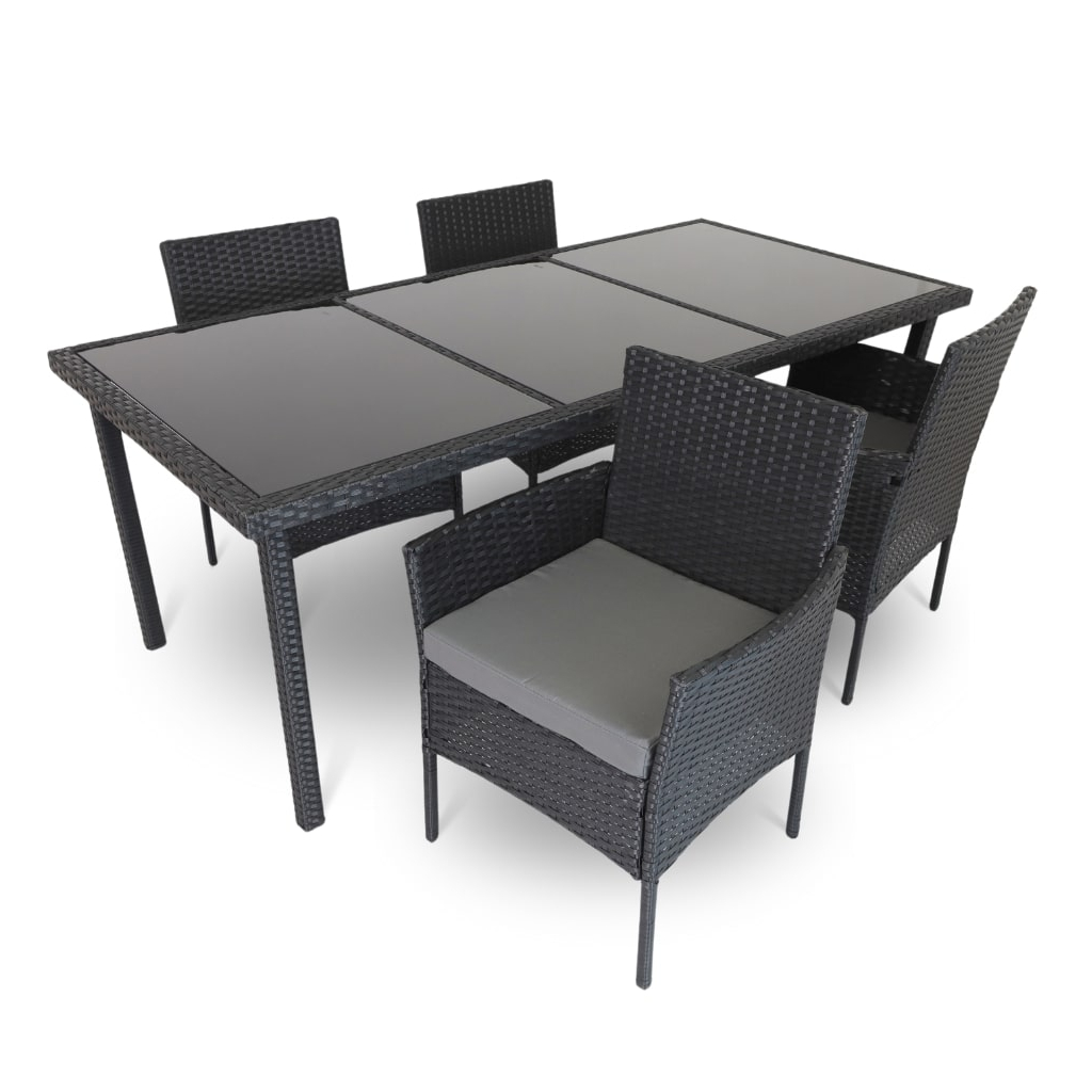 Konstrukce stolu i křesel je z černých kovových trubek a umělého ratanu. Ten zvládne déšť i letní slunce, a navíc příjemně větrá.