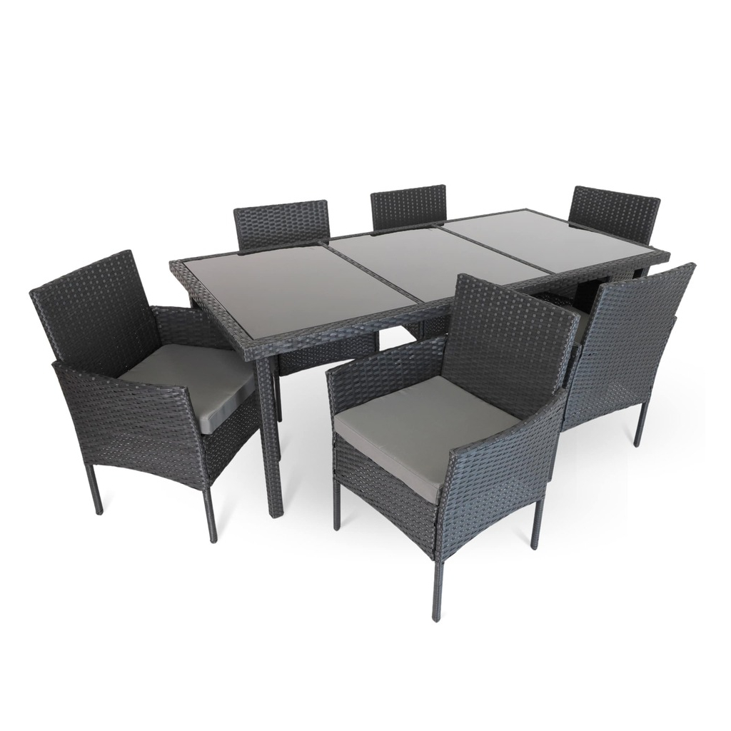 Konstrukce stolu i křesel je z černých kovových trubek a umělého ratanu. Ten zvládne déšť i letní slunce, a navíc příjemně větrá.