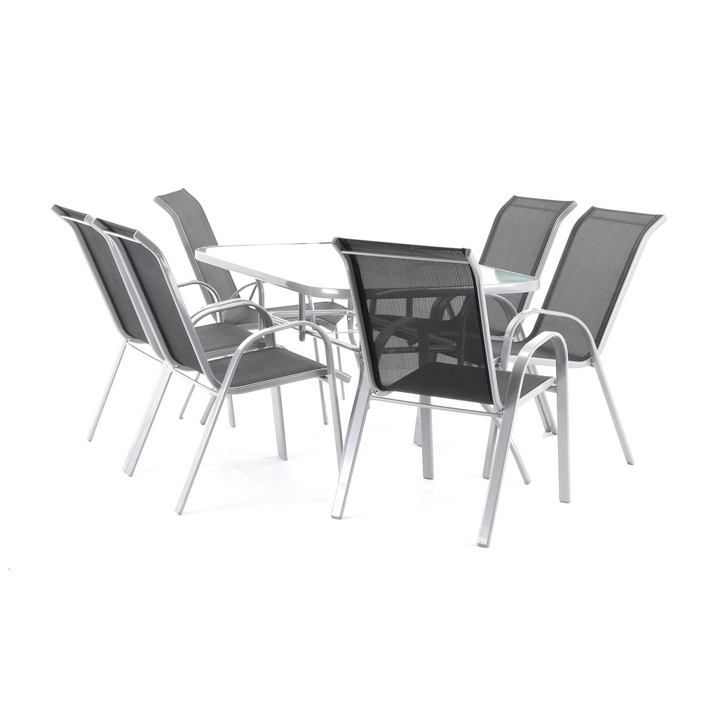 Konstrukce stolu i židlí je vyrobená z hliníkovo-ocelových profilů. Její povrch je ošetřen ochrannou komaxitovou barvou. Stolová deska je z tvrzeného skla a výplet židlí z voděodolného textilenu.