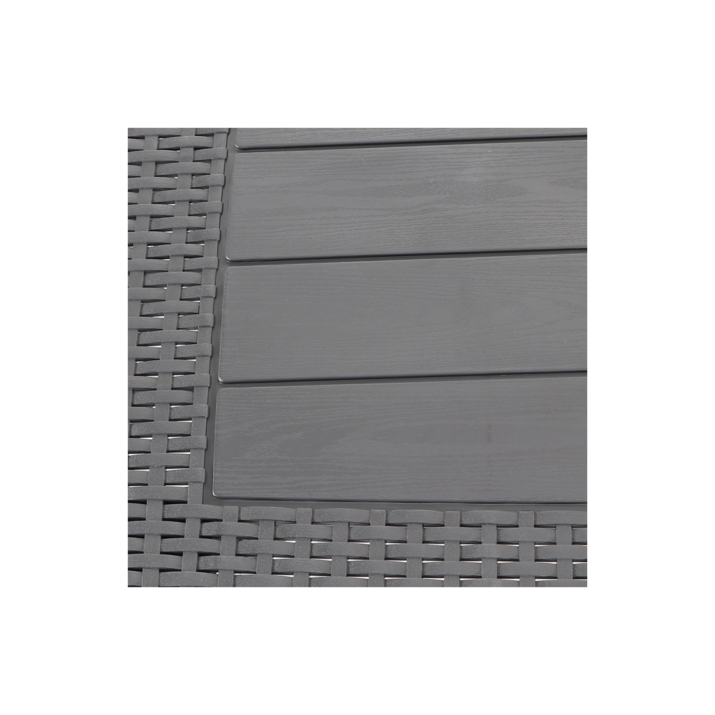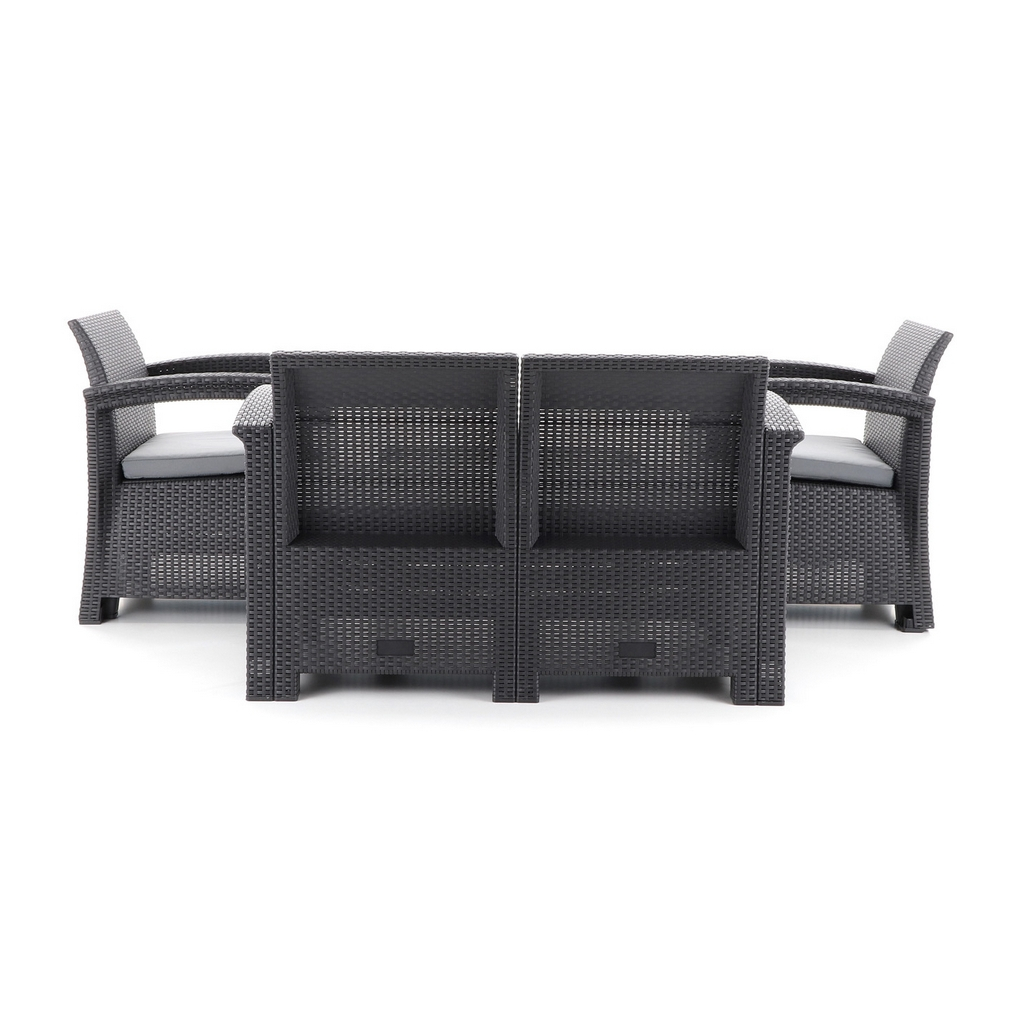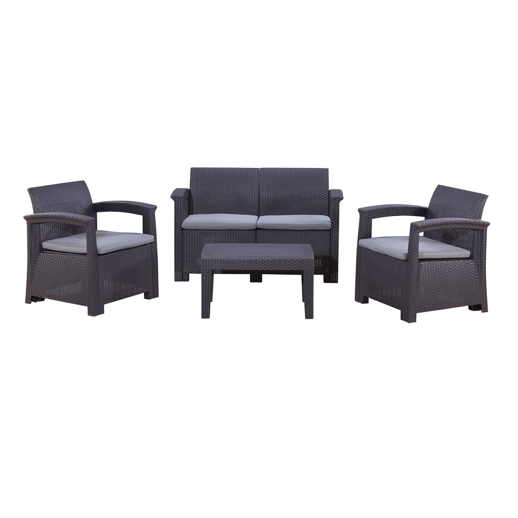 Konstrukce nábytku disponuje výpletem z umělého ratanu s UV filtrem. Součástí této zahradní sestavy jsou rovněž pohodlné látkové podsedáky o tloušťce 5 cm.