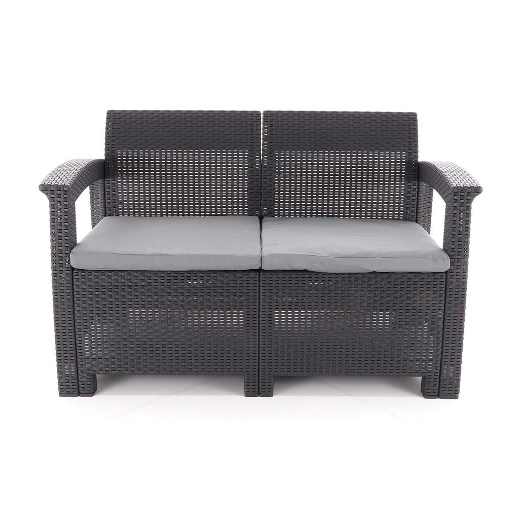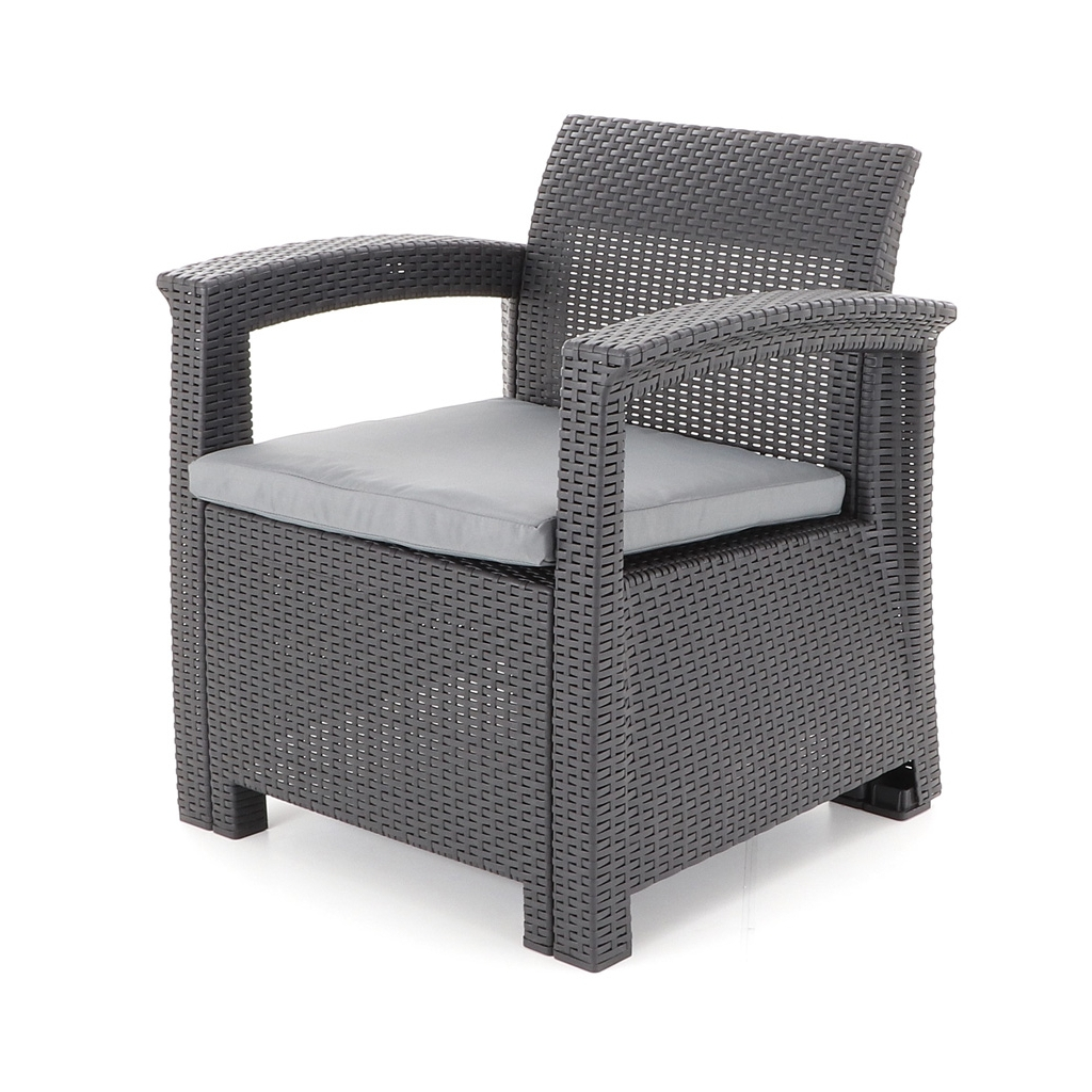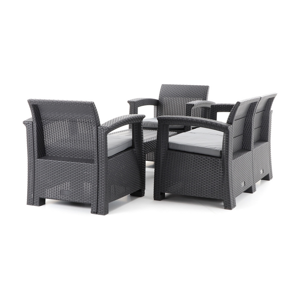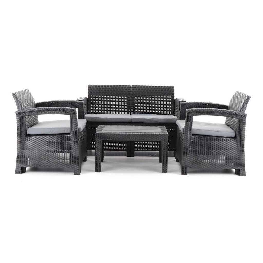 Konstrukce nábytku disponuje výpletem z umělého ratanu s UV filtrem. Součástí této zahradní sestavy jsou rovněž pohodlné látkové podsedáky o tloušťce 5 cm.
