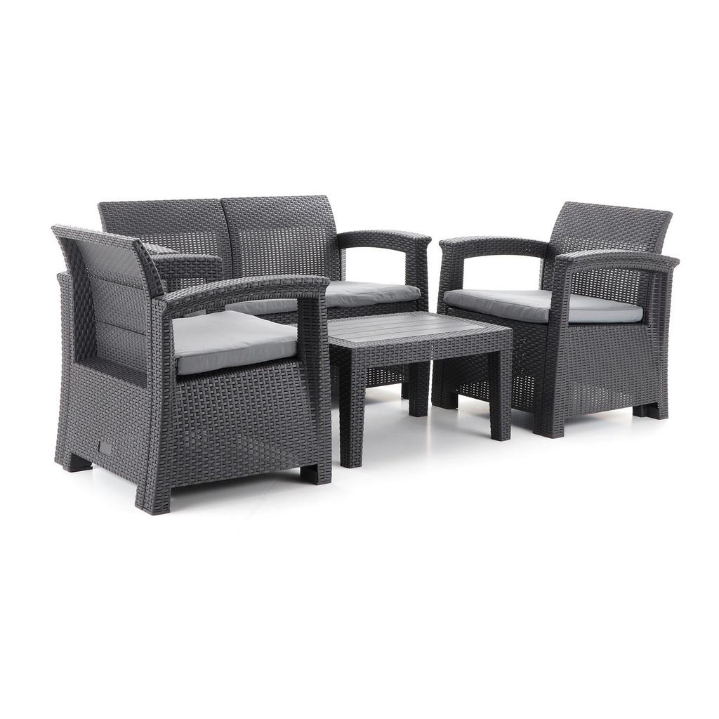 Zahradní sestava Noel se skládá ze stolku, 2 křesel a dvojsedáku a vytváří dohromady 4 místa k sezení. Využijete ji především na terasách, balkónech a v pergolových prostorech vaší zahrady či podniku.