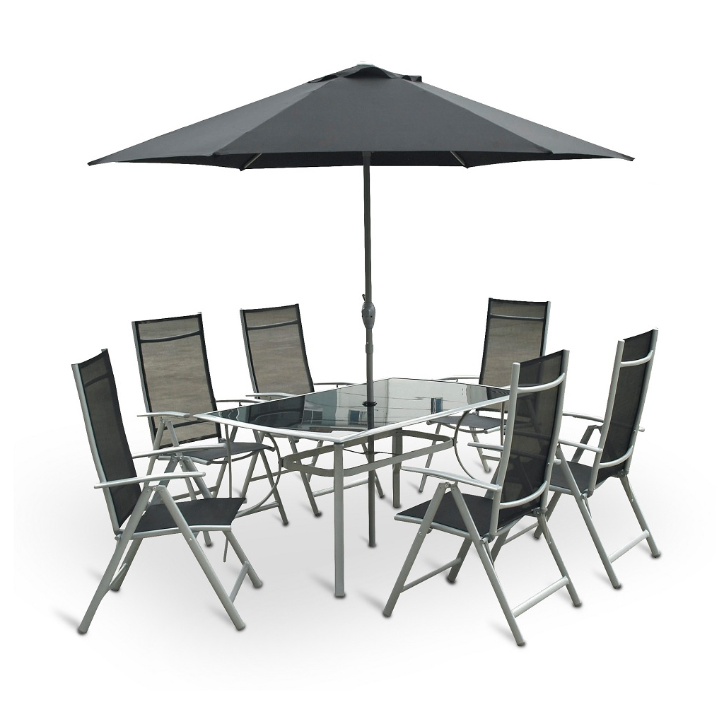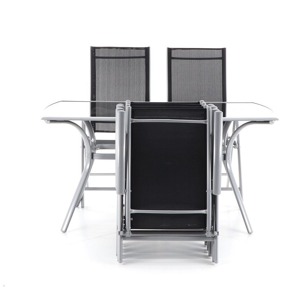 Konstrukce stolu i židlí je vyrobená z hliníkovo-ocelových profilů. Její povrch je ošetřen ochrannou komaxitovou barvou. Stolová deska je z tvrzeného skla. Součástí stolu je také praktický slunečník s kličkou, který vás uchrání před přímým slunečním svitem.