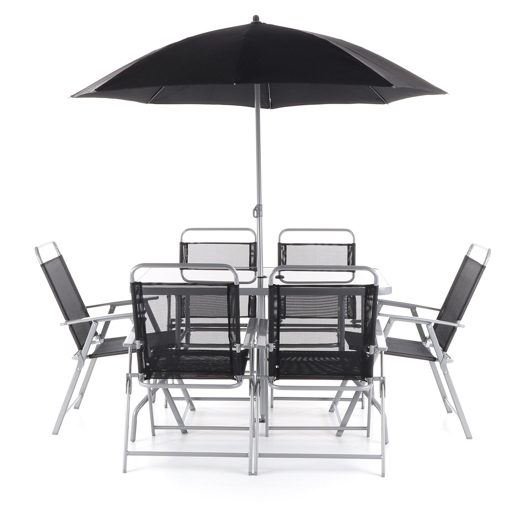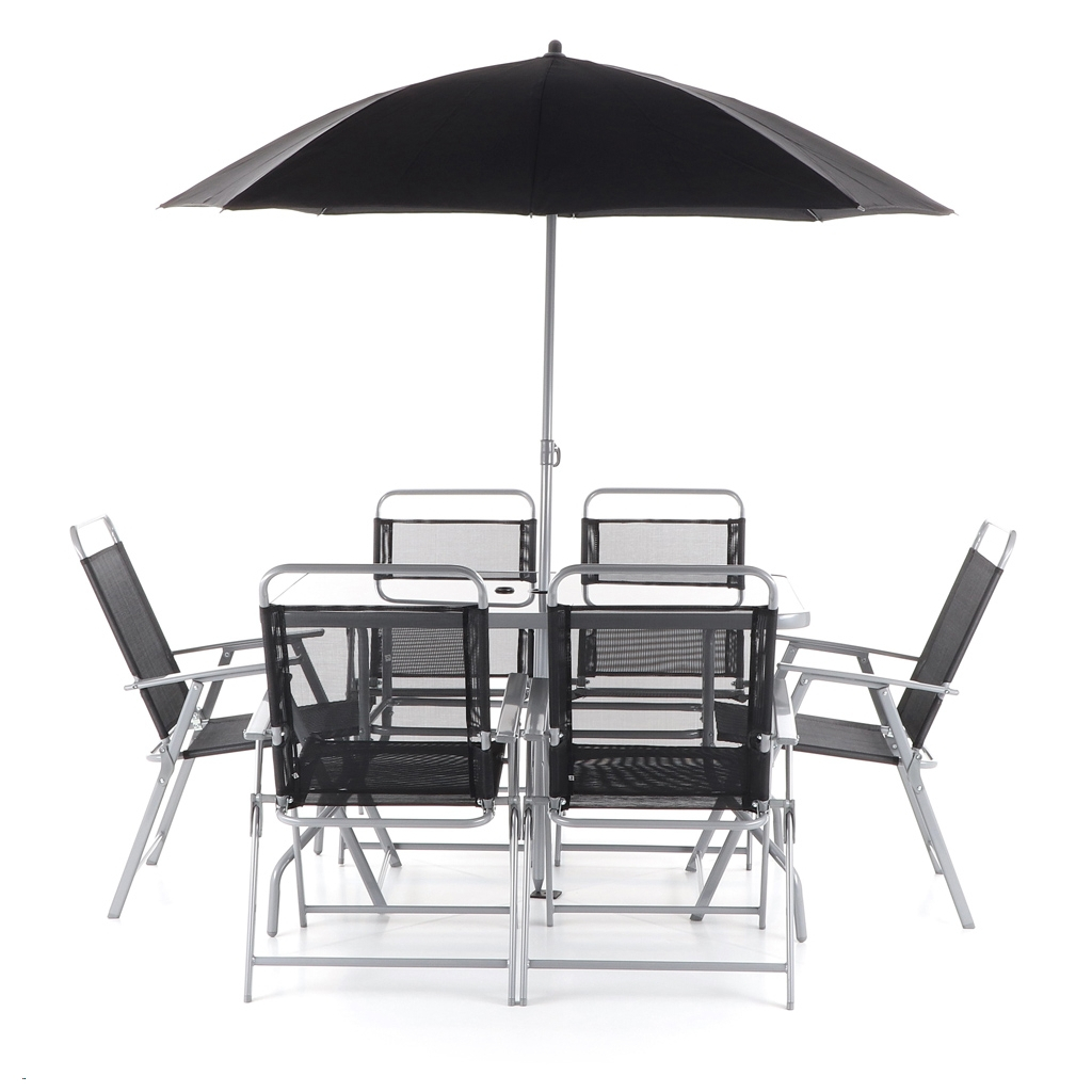 Konstrukce stolu i židlí je vyrobená z hliníkovo-ocelových profilů. Její povrch je ošetřen ochrannou komaxitovou barvou. Stolová deska je z tvrzeného skla. Součástí stolu je také praktický slunečník s kličkou, který vás uchrání před přímým slunečním svitem. Průměr slunečníku je 200 cm.