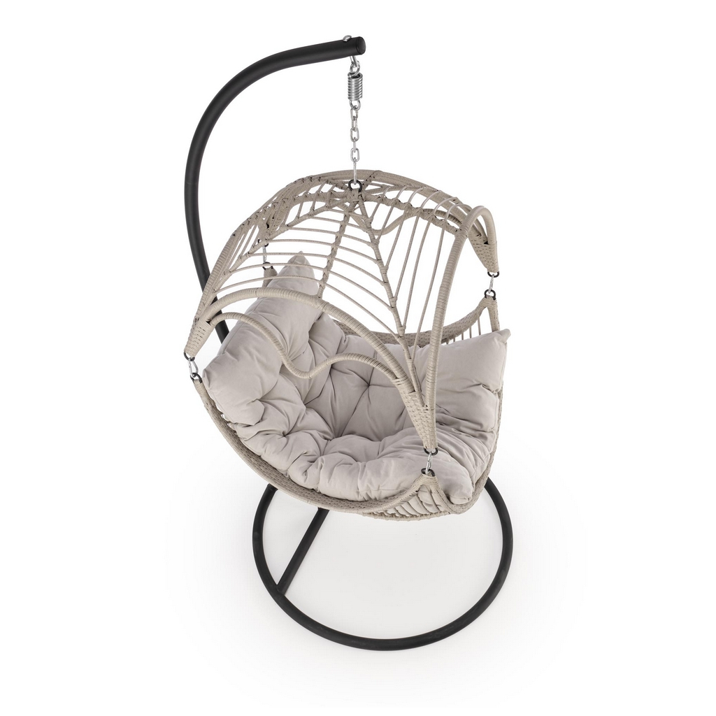 Sedací část tvoří práškovaná ocel opletená umělým ratanem. Dohromady tak dávají odolný celkem, který se nezalekne slunce ani deště. „Vajíčko“ je zavěšené na stabilním stojanu taktéž z práškované oceli. Zajímavostí je řešení sedací části, kdy horní polovina je s tou spodní spojená kovovými karabinami.