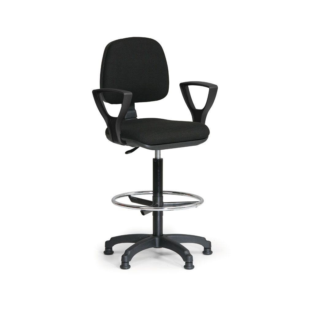 Zvýšená pracovní židle Milano s područkami je skvělou volbou do průmyslových oblastí, zejména pak do montážních hal k pracovním linkám. Židle je vybavena pístem pro výškové nastavení a i díky vestavěným plastovým područkám zajistí při práci vždy pohodlné sezení. Výška sedu od země u této židle dosahuje až 79 cm a i díky tomu má opěrný kruh pro podložení vašich nohou.