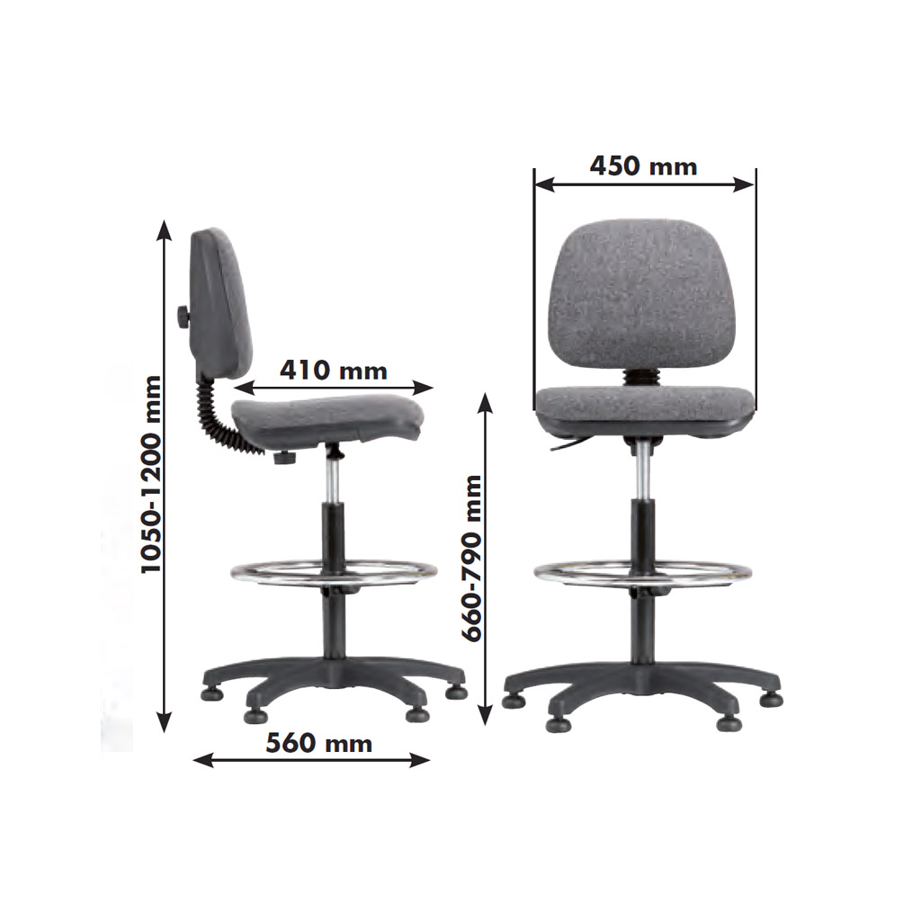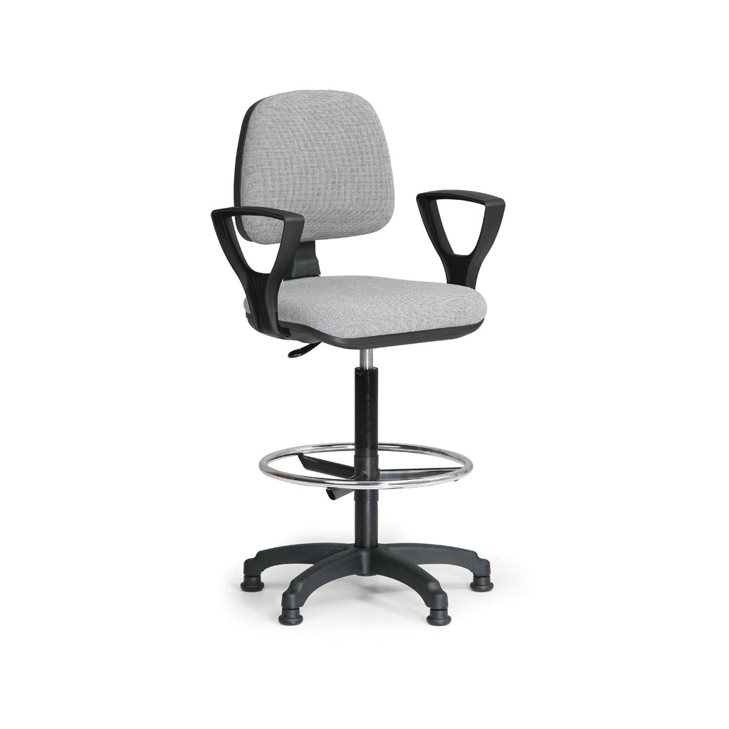 Zvýšená pracovní židle Milano s područkami je skvělou volbou do průmyslových oblastí, zejména pak do montážních hal k pracovním linkám. Židle je vybavena pístem pro výškové nastavení a i díky vestavěným plastovým područkám zajistí při práci vždy pohodlné sezení. Výška sedu od země u této židle dosahuje až 79 cm a i díky tomu má opěrný kruh pro podložení vašich nohou.